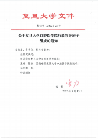 2022年9月16日,复旦大学于口腔医院召开干部会议,正式宣布成立复旦大学口腔医学院。