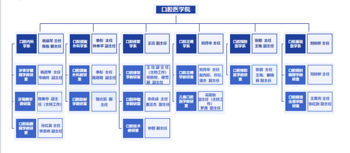 2023年, 复旦大学口腔医学院成立口腔内科学系、口腔颌面外科学系、口腔修复学系、口腔正畸学系、口腔预防学系和口腔基础学系六个学系以及13个教研室。