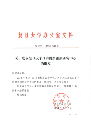 2024年8月,经复旦大学校长办公会议审议通过,成立复旦大学口腔融合创新研究中心,挂靠口腔医学院。